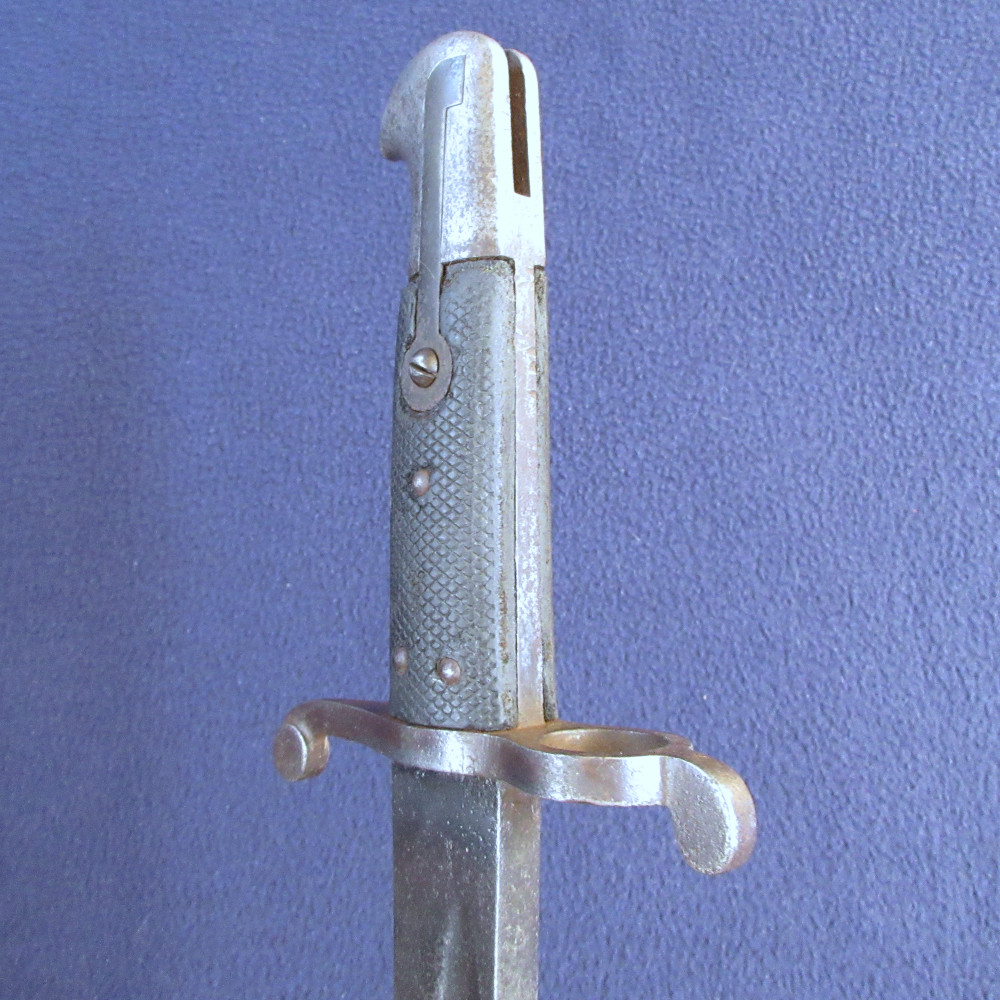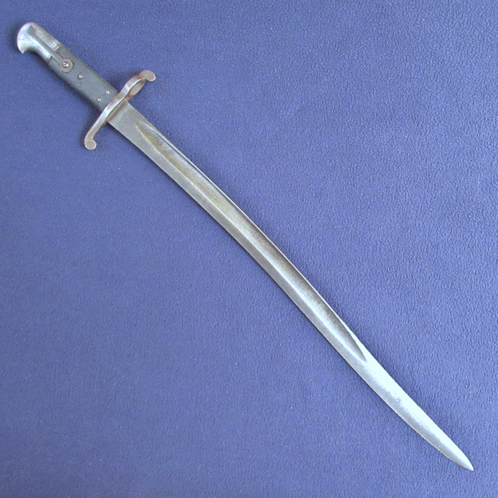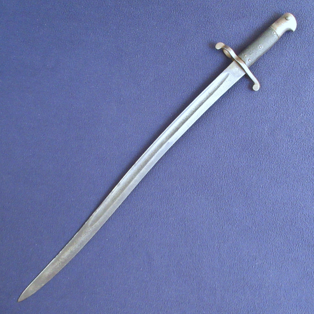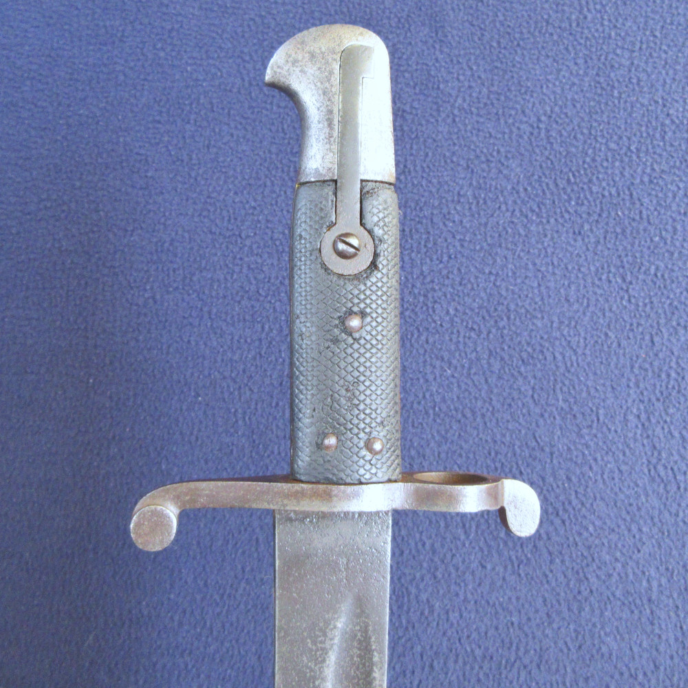 Single-fullered ‘yataghan’ downward-curving blade, cross hilt with lower quillon with round finial, and upper quillon projecting from the muzzle ring. Black chequered grips of pressed leather, attached to the tang with three rivets on one side and four on the other. External leaf spring which actuates the locking catch, attached by a single screw. Steel beaked pommel with distinctive circular mortise slot of the Whitworth. No scabbard.