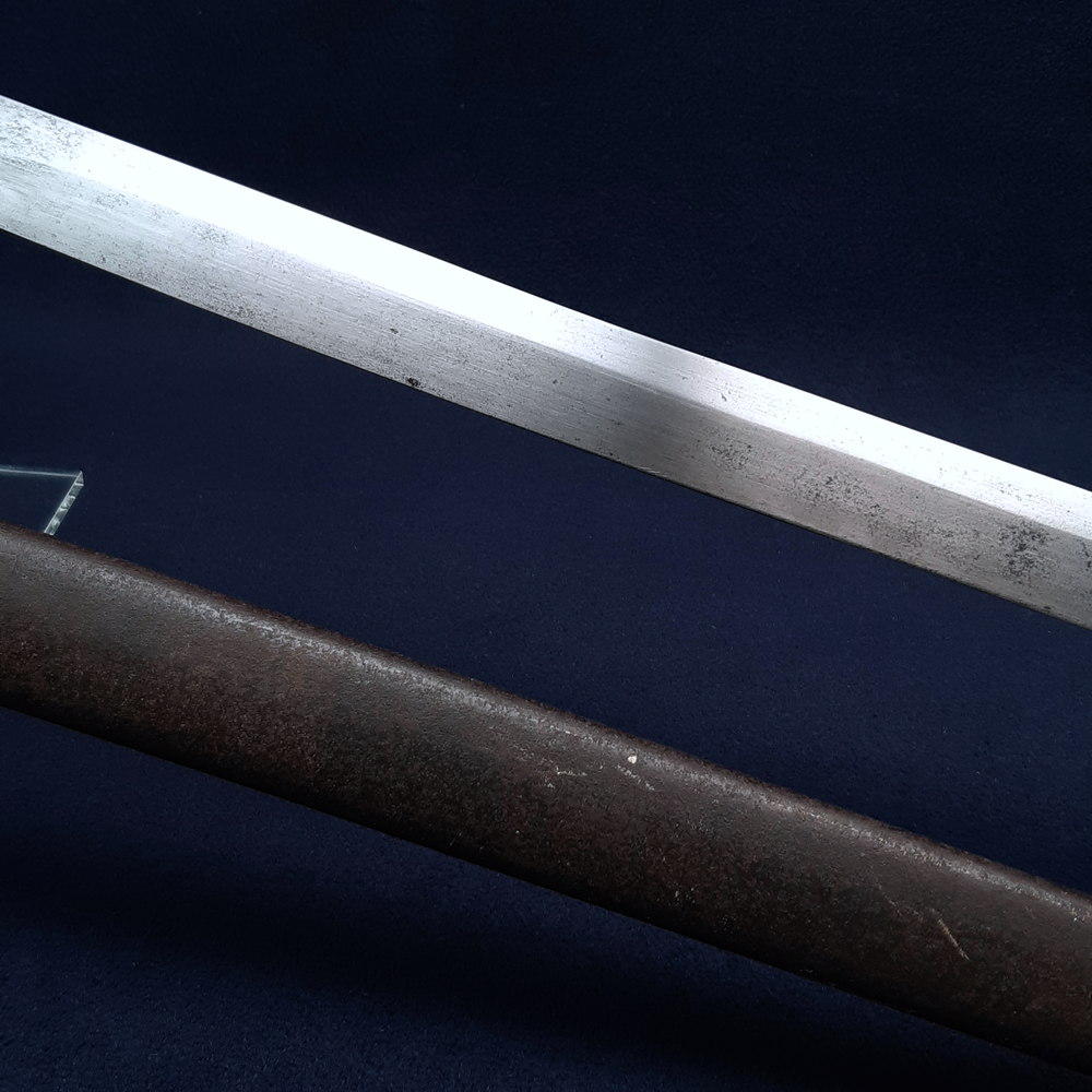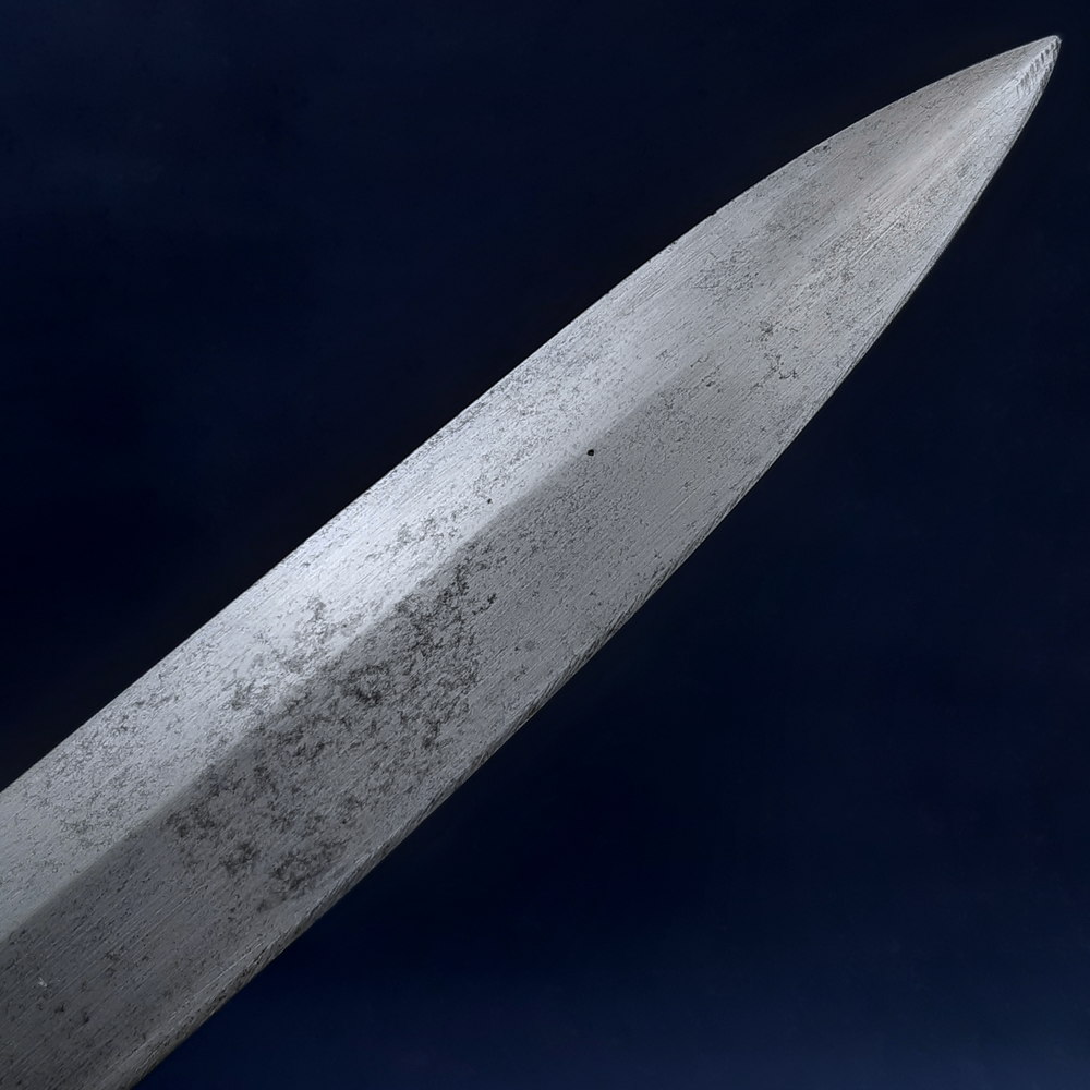 One edge of the double-edged, diamond profile blade has been ground down to form a flat spine and clear the way for the rifle to be fired. The blade was originally leaf-shaped broadening slightly along its length, and this is still visible in the remaining edge. The shoulder of the blade has been slimmed on both sides. With no fuller and no additional distal taper the blade remains noticeably heavy for a bayonet: a standard M1866 weighs 622g while this piece weighs 774g, despite being nearly 10cm (4in) shorter.