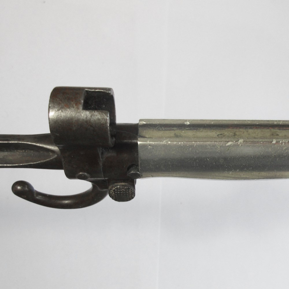 The locking button works and the bayonet looks like it will still mount to a rifle, but it has been shortened so far that it may well have been used as a fighting knife. Dark patina to hilt and blade, some pitting towards tip of blade. Hilt has inspection marks and is numbered ‘67576’. Two inspection marks to blade just above hilt.