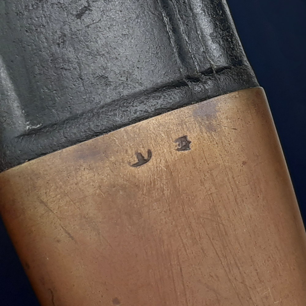 The blade is engraved on one side at the forte with the maker’s mark ‘Manufre Rale de Chatellerault’ (Manufacture Royale) and on the other side with ‘Fbre 1839’ next to which it is stamped with two French ‘poincon’ inspection stamps at the shoulder. The hilt is stamped on one side with the serial number ‘165’. The chape piece of the scabbard is faintly stamped with two poincons. The leather of the scabbard is stamped with the maker’s mark ‘GIRARD LOUIS A CHÂTELLERAULT’.