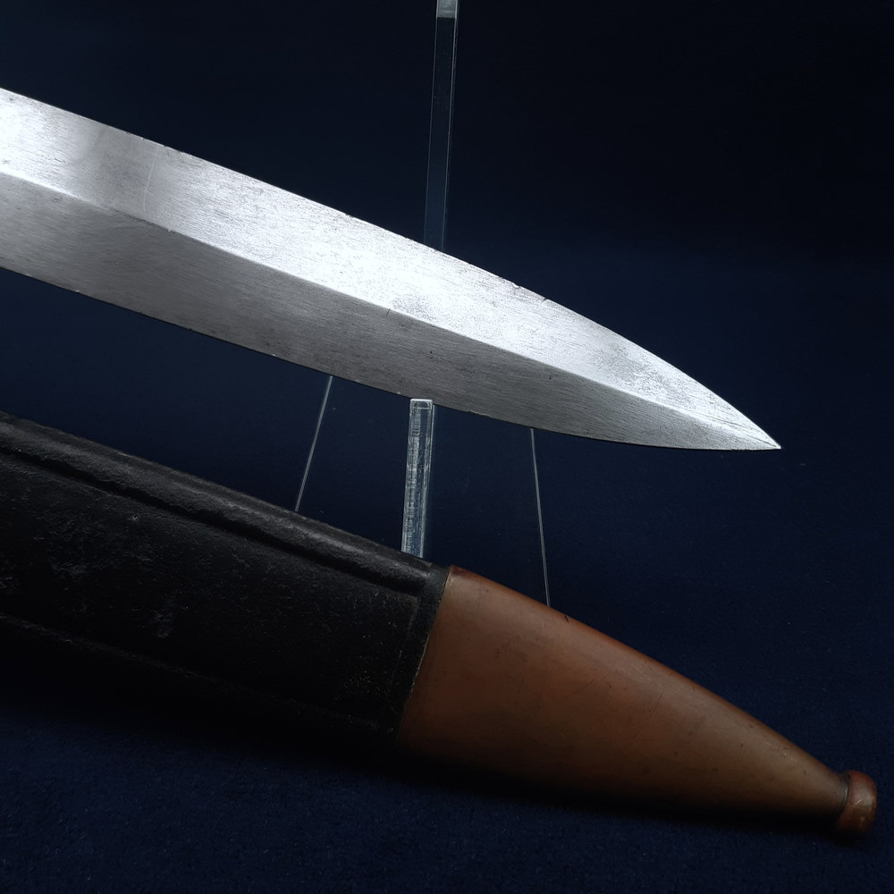 The blade is unsharpened with multiple nicks to both edges. The blade has light speckled patination, with some spots of heavier patination including at the shoulder. A few small dents to the brass throat piece of the scabbard. The scabbard leather is good with some small dents on both sides and chunks of abrasion on the lower front face. All of its stitching is intact.