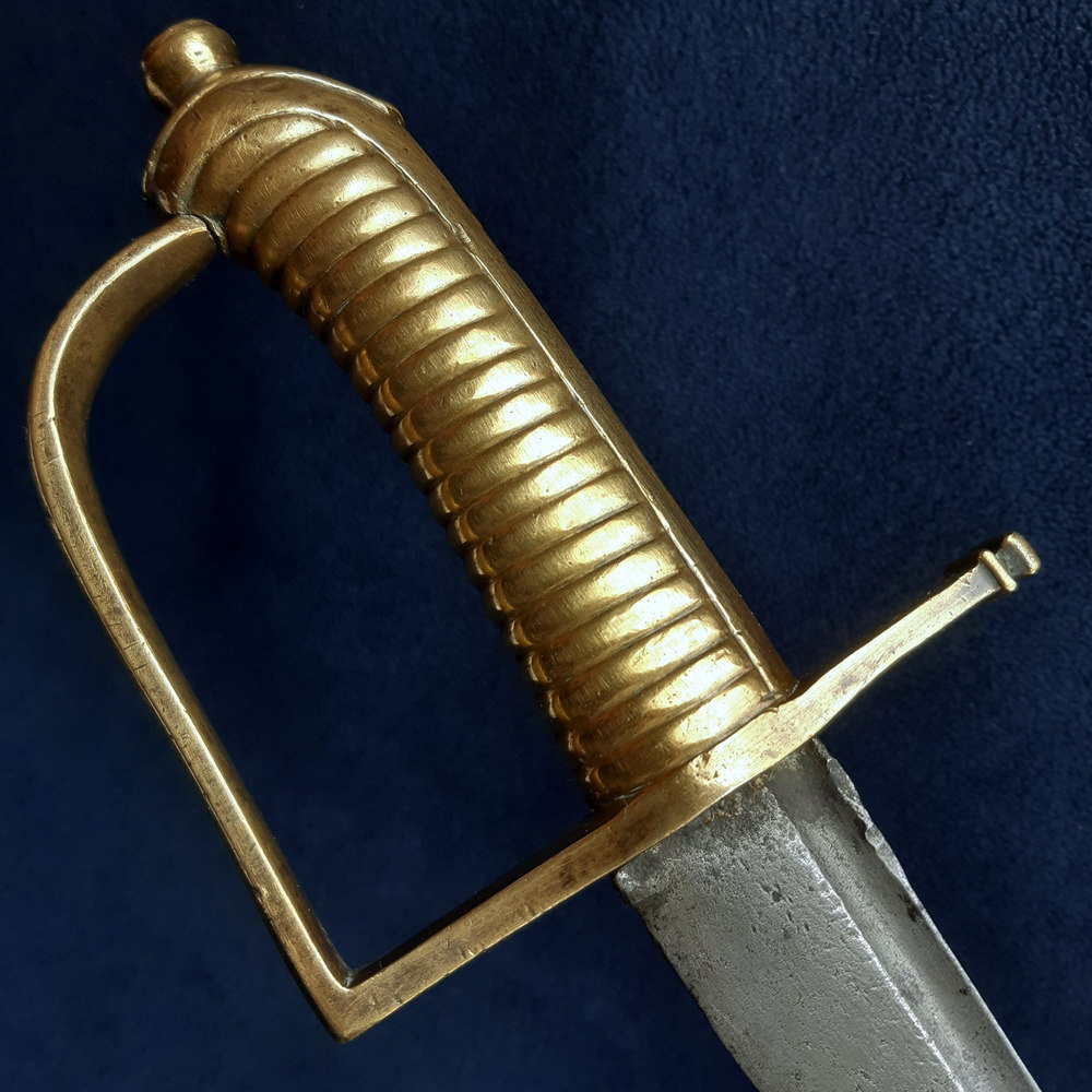 Single-edged hanger blade with narrow fuller running close to the spine and hatchet point. Solid cast brass hilt with ribbed grip, smooth backstrap, quillon with squared cushion finial, knucklebow hilt and tang button. No scabbard. Blade ~24½ inches (63.1cm) in length, the sword ~30 inches (76.9cm) overall.