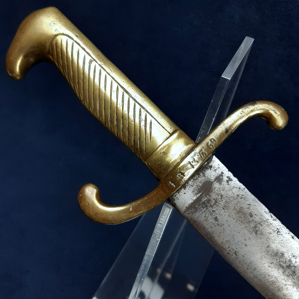 The hilt is stamped on one side with ‘A B 73 3 69’, possibly a unit mark and on the other side with a crown over ‘FW’ over ‘66’ indicating that it was made in 1866, as well as with a crown over U, and the numbers ‘3.’ and ‘100.’. The flat spine of the grip is stamped with ‘O.R. 91.12C.126.’, which is probably another unit mark.