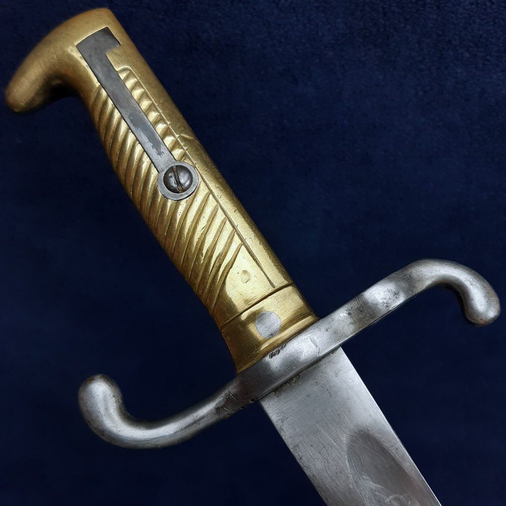 Single fullered, spear pointed blade. Steel hilt with forward upper quillon atop the muzzle ring and reverse lower quillon. Brass grip with beaked pommel, steel external leaf spring for the locking mechanism. Black leather scabbard with brass fittings at the throat and chape. Blade 18½ inches in length, the bayonet 23½ inches overall.