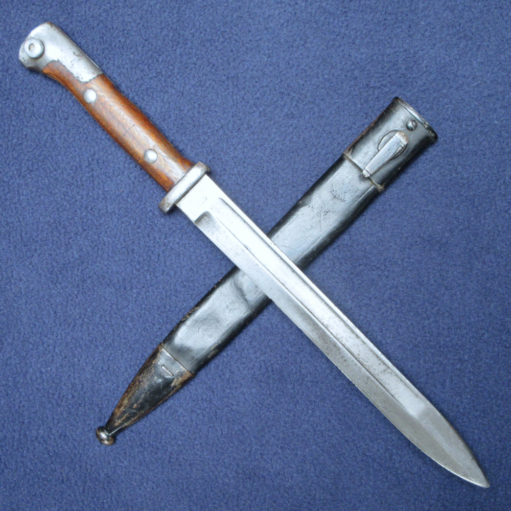 These bayonets were produced from 1909 to fit the Mauser M98 rifle. While they were a new type they made use of converted blades from the previous standard pattern bayonet, the 71/84, fitted to a new hilt and with the muzzle ring removed. These were issued with surplus scabbards of the previous model. As seen with the 71/84, the blades come in two variations with a long or short fuller – this example has the earlier short fuller which was produced until late 1888, after which the fullers were lengthened.