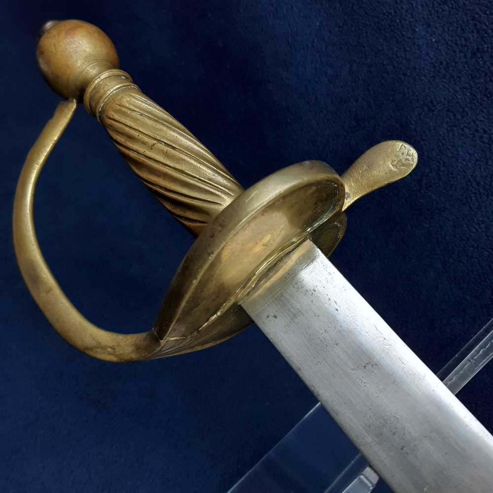 The blade has a bright polished finish. There are a few small nicks to the blade around its midsection and some very small patches of pitting in the same area. The brass of the hilt has an even patina, with the usual minor dents and some brown spotting. It has one small crack near where the knucklebow meets the hilt, but remains solid with no movement. The quillon is bent slightly to one side.