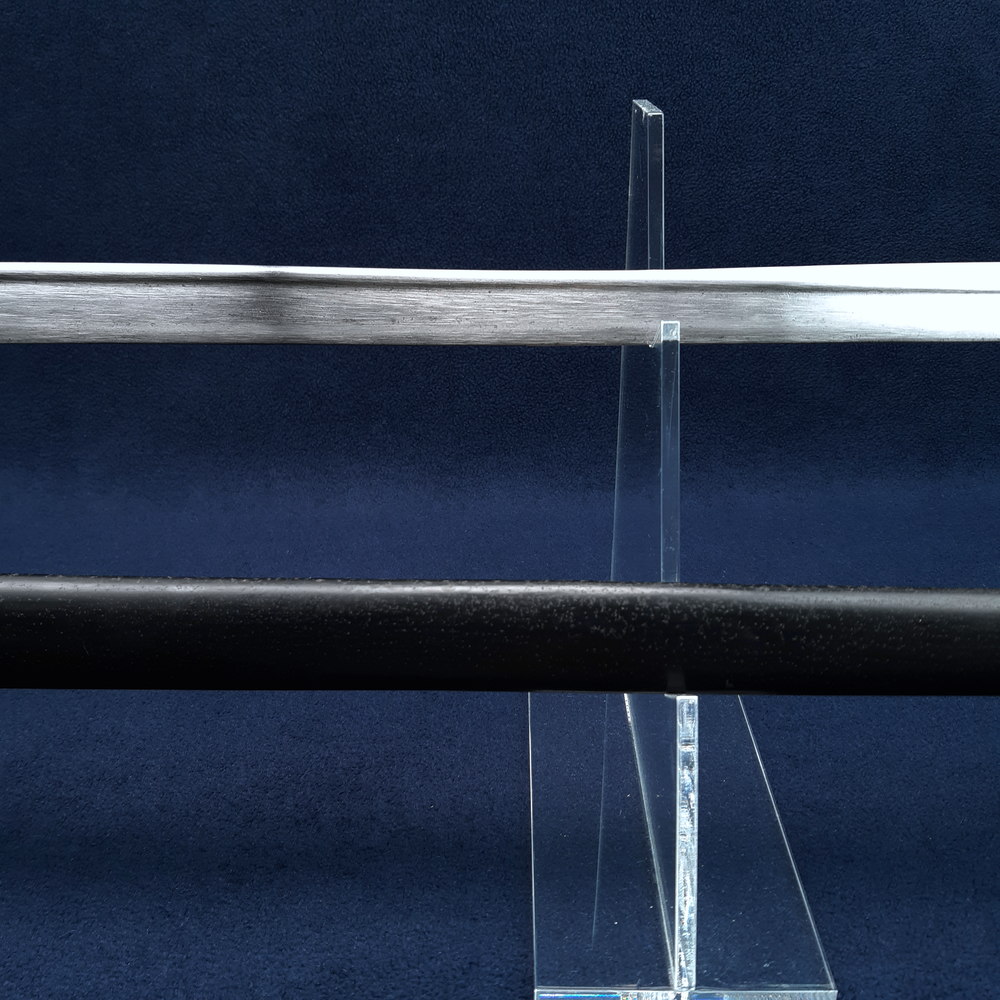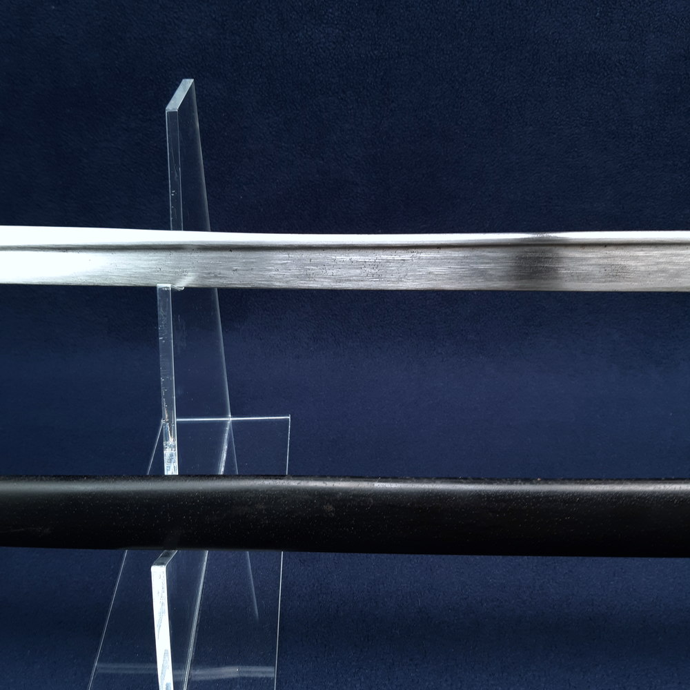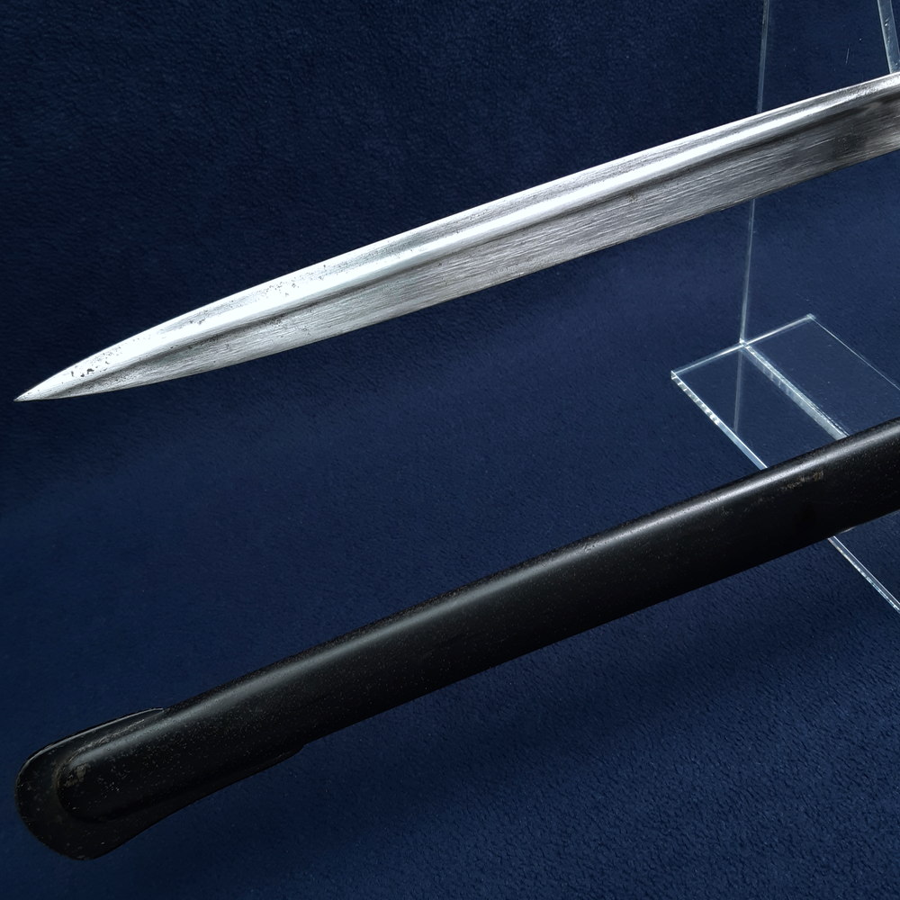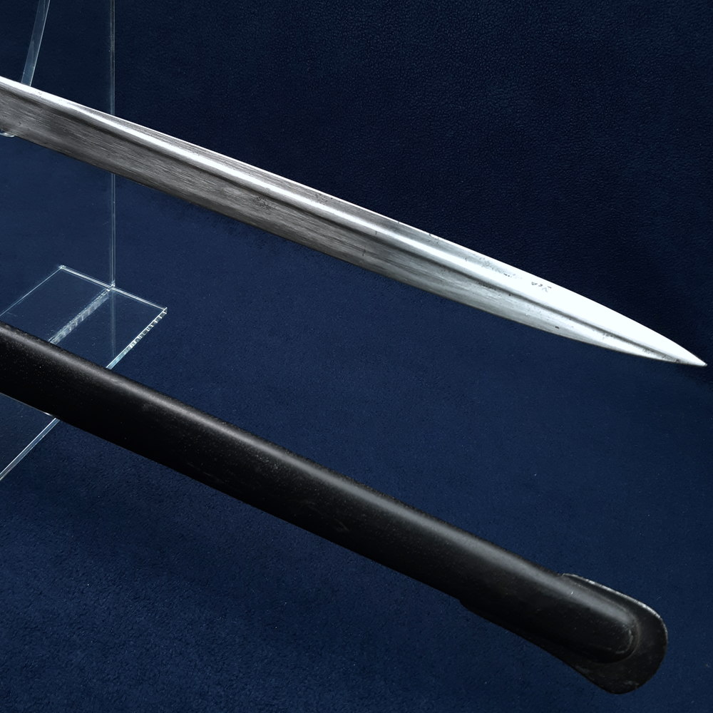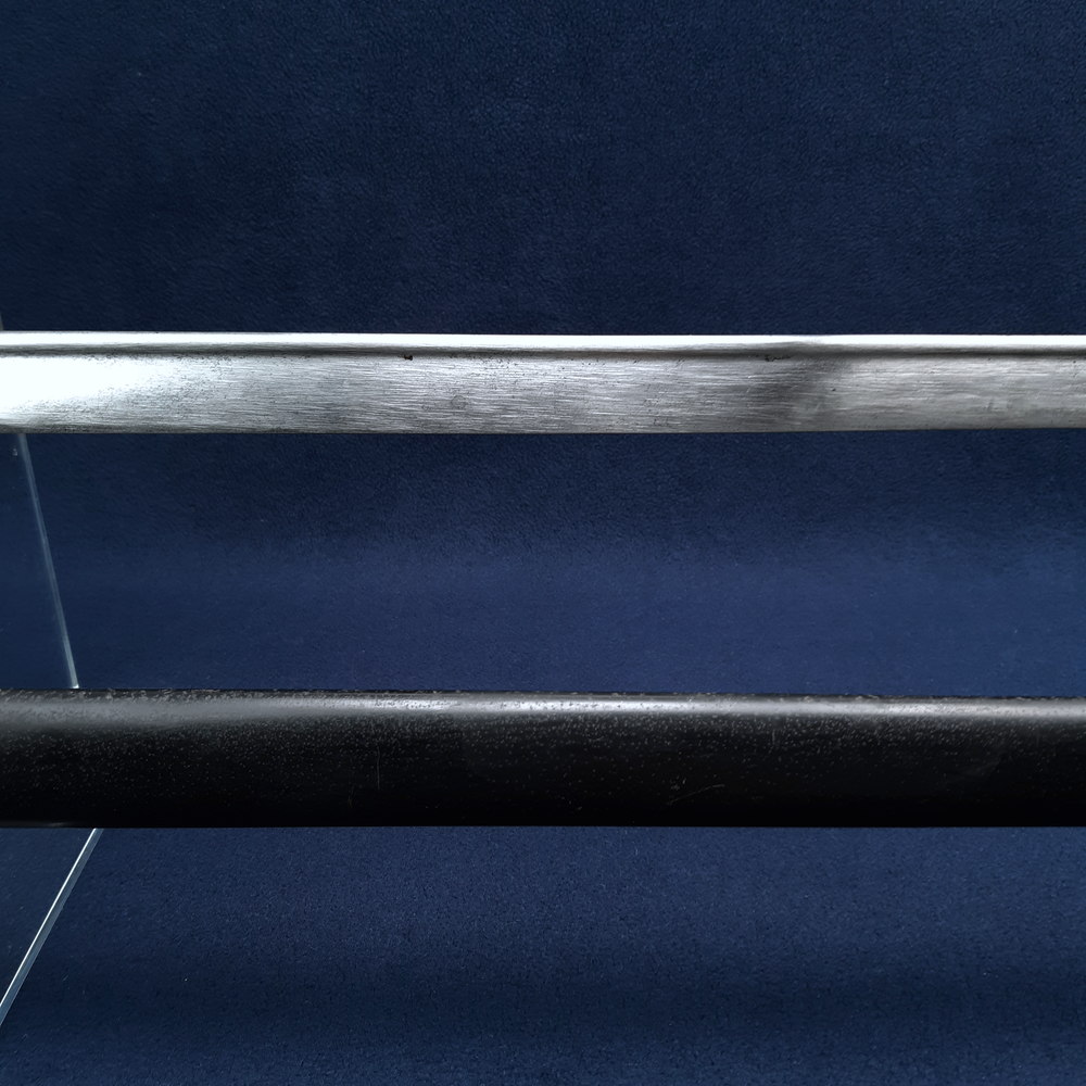The blade is excellent, bright with no edge damage and only a few spots of light patination. The hilt, ferrule, backstrap and scabbard all retain a deeply blued finish with some spotted dark patination and very minor wear at raised edges. The grip’s wire binding is all intact and tight, some very small patches of abrasion to the grip leather at the pommel end. The scabbard has only a few very shallow dents and retains both of its throat screws. It has been painted black, most of this paint is intact with a few scrapes and some spotted wear.