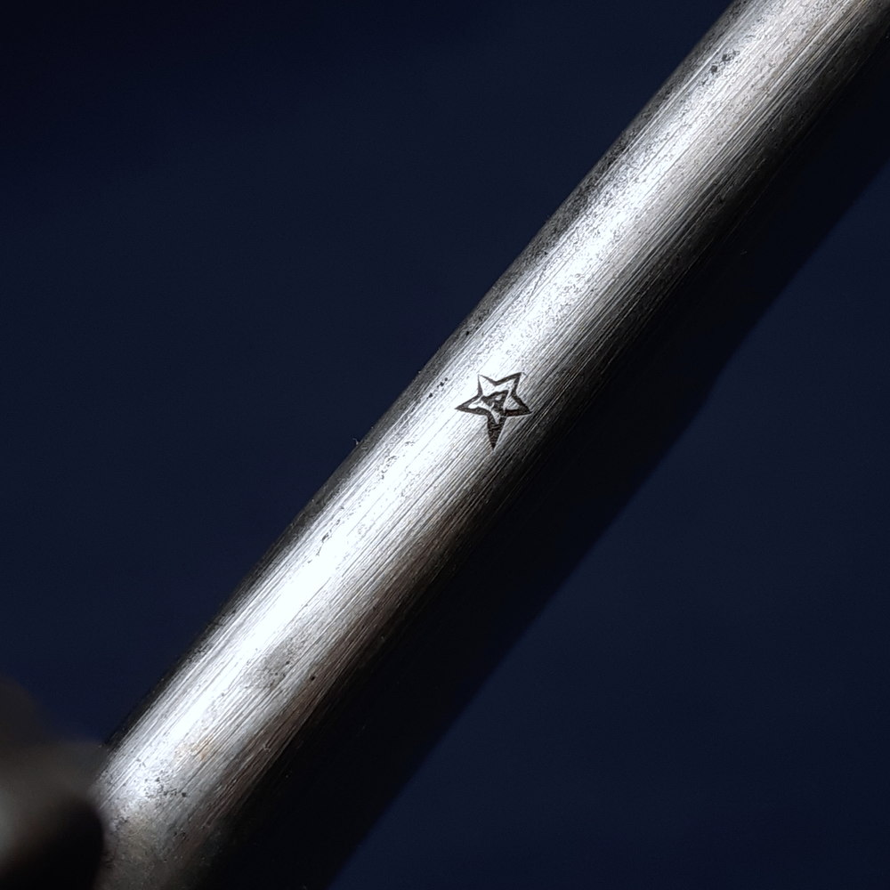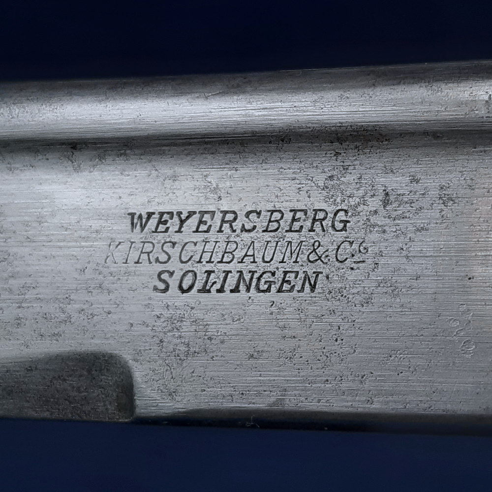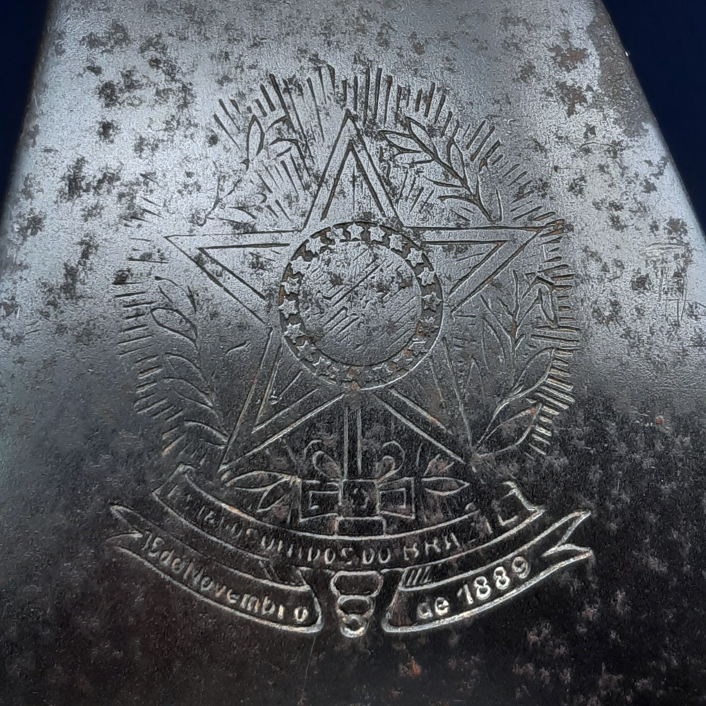 The blade is stamped at the ricasso on one side with the German manufacturer’s name ‘WEYERSBERG, KIRSCHBAUM & CO SOLINGEN’, and on the spine with a 5 pointed star surrounding the letter ‘A’, which is a Brazilian inspection mark. The outside of the hilt is stamped with the crest of the then newly formed Brazilian Republic, including 5-pointed star and banners reading ‘ESTADOS UNIDOS DO BRAZIL’ and ‘15 De Novembro De 1889’, the latter being the date of its establishment.