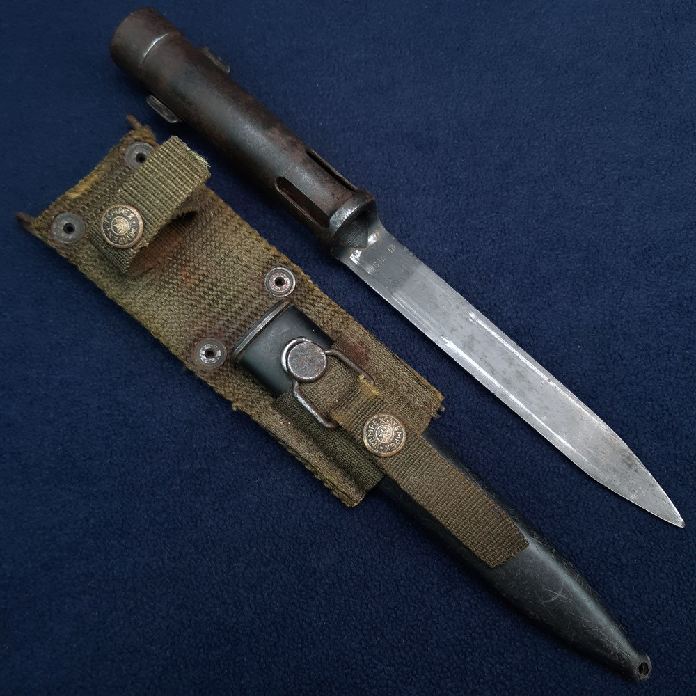 The bayonet retains some of its original blued finish, with some wear and rust spotting to the socket. The blade is free of rust, protected by its scabbard, with some wear to the tip. The locking catch of the bayonet and the frog stud & throat piece of the scabbard have some wear to their black lacquer. Minor rubbing and scratching to the plastic scabbard body and belt grip. Light rust to some of the scabbard rivets and wire hanger.
