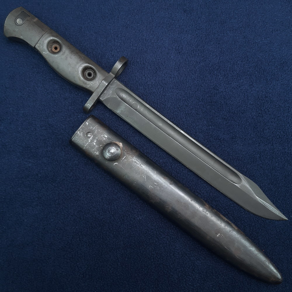 The Australian bayonets were produced at the Lithgow plant from 1958 to around 1984. Until around 1962 they had squared fullers, this example has the post-1962 rounded fullers instead.