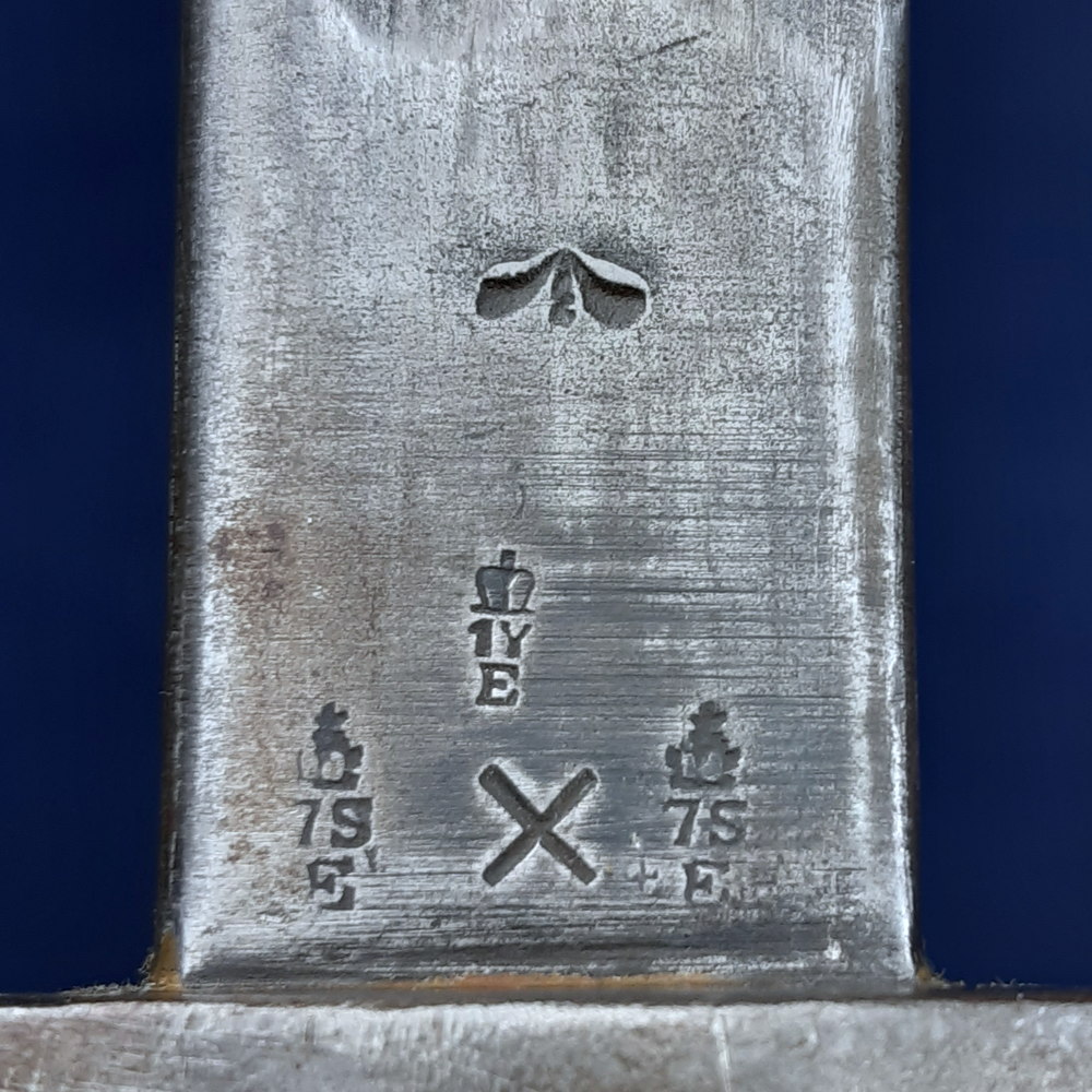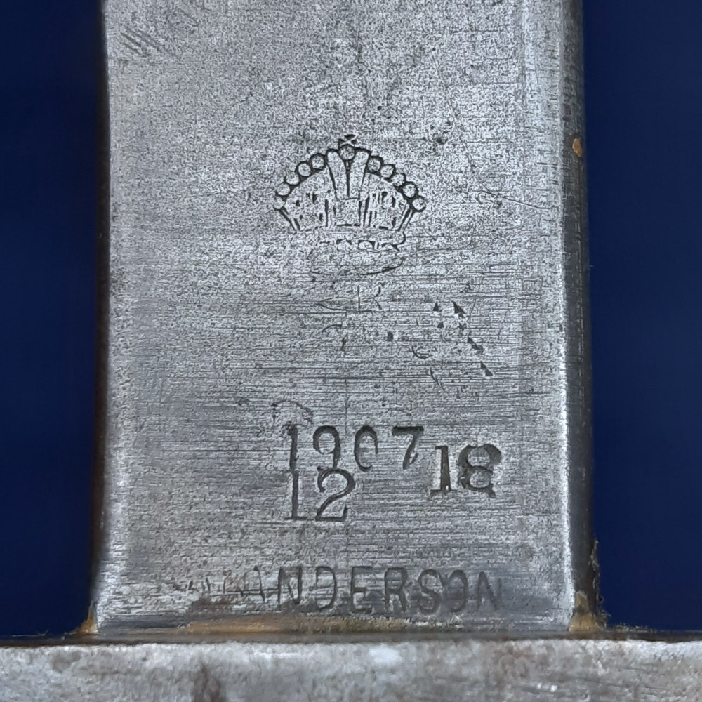 The ricasso is stamped on one side with a crown over ‘1907’ (the pattern) ’12 ‘18’, indicating the manufacture date of December 1918, and the manufacturer’s mark ‘Sanderson’. On the other side it is stamped with a ‘broad arrow’ War Department stores mark, three crown inspection stamps with ‘E’ for Enfield and an ‘X’ indicating that it passed a manufacturer’s bending test.