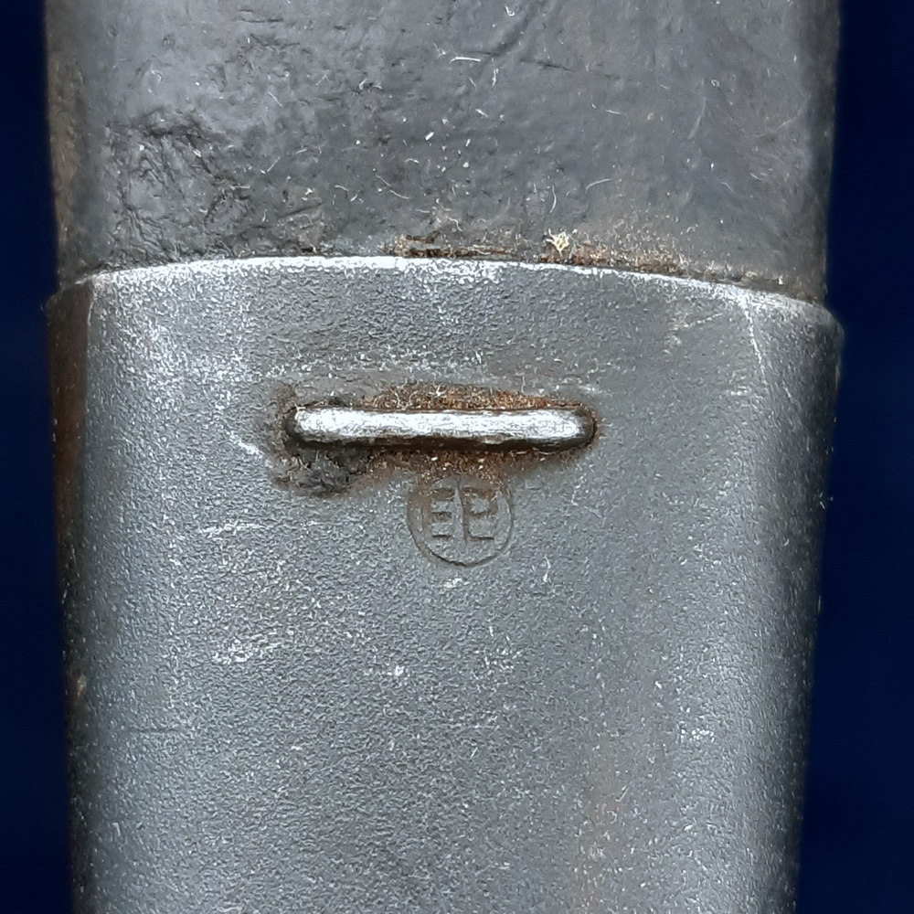 The pommel is stamped next to the locking button with a letter ‘U’ enclosing a broad arrow, which is a South African government ownership mark. While it was manufactured in Britain, this bayonet evidently came into South African ownership. The chape piece of the scabbard is stamped next to the staple with ‘EB’ within a circle, which is probably a manufacturer mark.