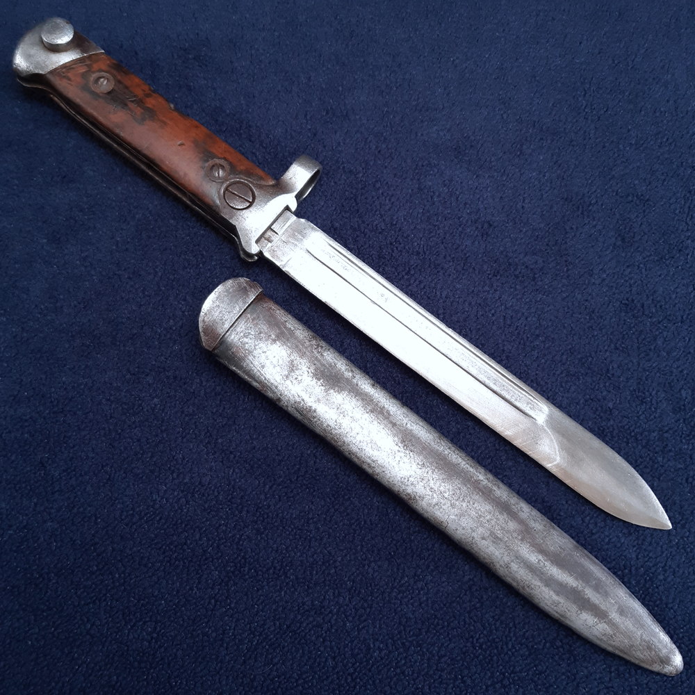 This bayonet was initially issued with the M1938 Carcano infantry rifle and its ‘Moschetto’ carbine version, its folding blade allowing the bayonet to be left affixed to the rifle rather than returned to the scabbard when not in use. However, the folding mechanism was found to be a point of structural weakness and the blade tended to rattle when locked open or locked closed (this bayonet is no exception, there is up-down as well as left-right movement in the locked position).