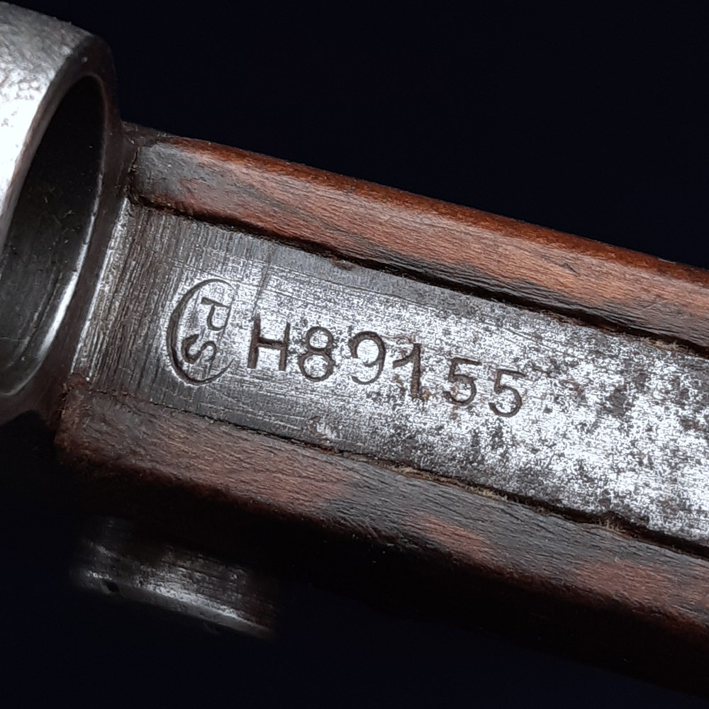 The ‘tang’ (not actually connected to the blade) is stamped next to the muzzle ring with ‘H89155’ as well as ‘PS’ within an oval.