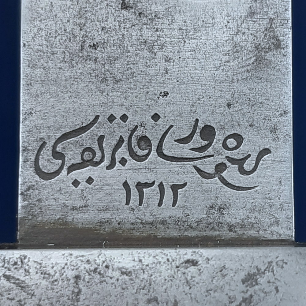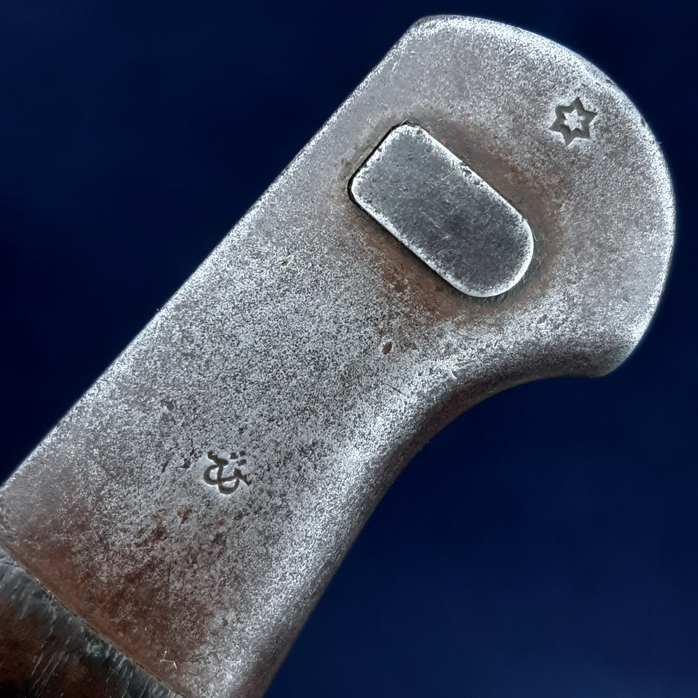 The blade is stamped at the ricasso on one side with the manufacturer’s name in Ottoman Turkish, rendered in the contemporary Osmanli script, which translates to ‘SAUER FACTORY, SUHL’, along with the date ١٣١٢ (1312), which is in the Rumi date system and equates to 1896 AD. The spine of the blade is stamped with a crescent moon and six-pointed star, the Turkish national symbol still seen on their flag.