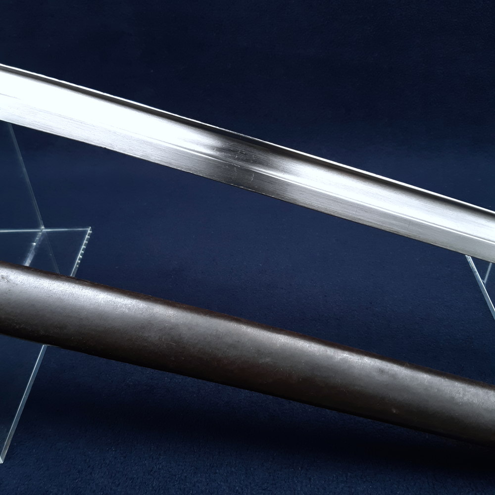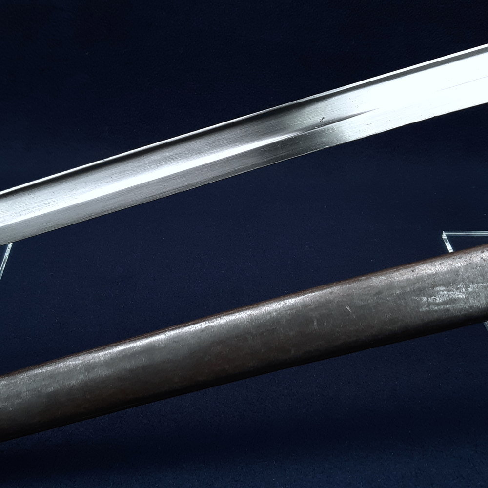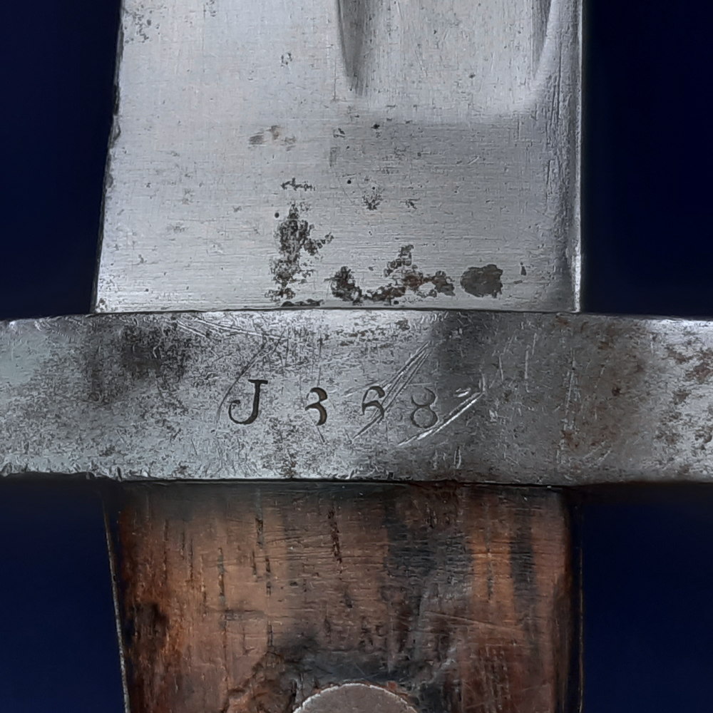 No maker’s mark to the spine of the blade – it may have been removed by polishing. The ricasso of the blade is stamped on one side with a clover-shaped Portuguese inspection mark. The hilt is stamped faintly on one side with ‘another clover inspection mark and on the other side with ‘J668’. The exposed tang is stamped with ‘7’. The throat of the scabbard is stamped with ‘NN63F’. The frog stud of the scabbard is faintly marked ‘WG’, a Steyr factory mark.