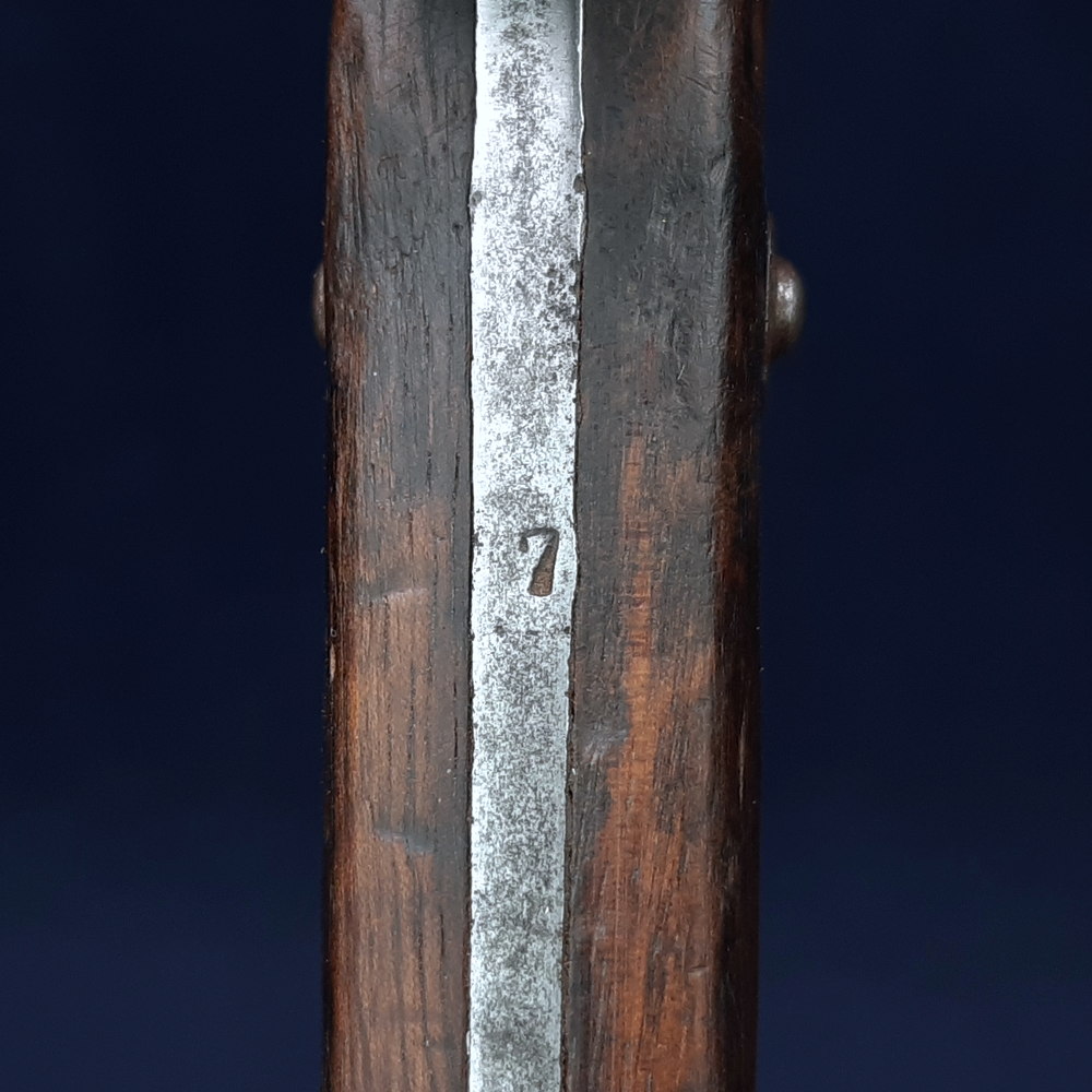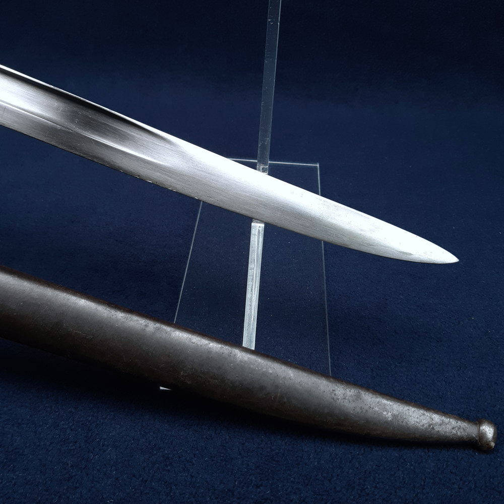 Single-fullered ‘yataghan’ downward-curving blade with spear point, steel cross hilt with straight lower quillon & circular finial, and upper quillon projecting from the muzzle ring. Brown wood slab grips riveted to the exposed tang, steel pommel with locking button, plain steel scabbard with frog hook. Blade 18½ inches in length, the bayonet 23½ inches overall.