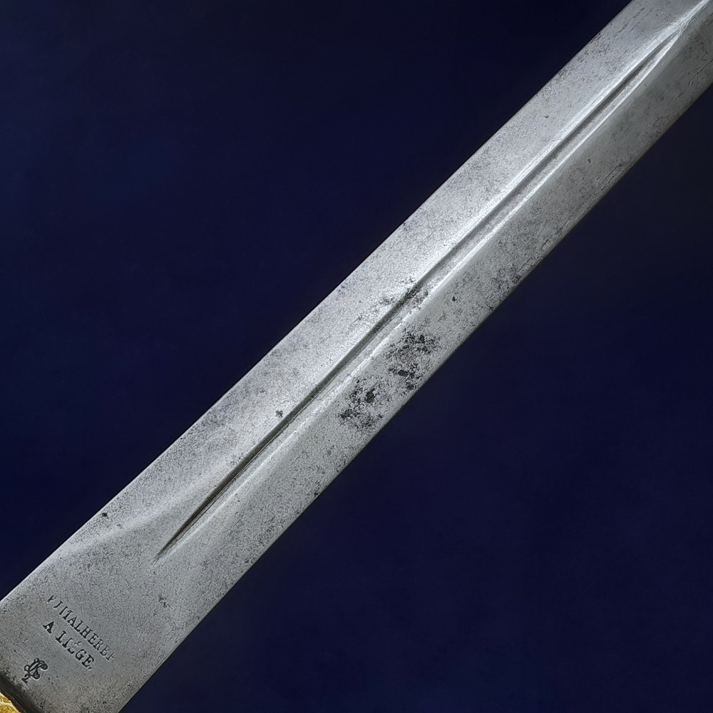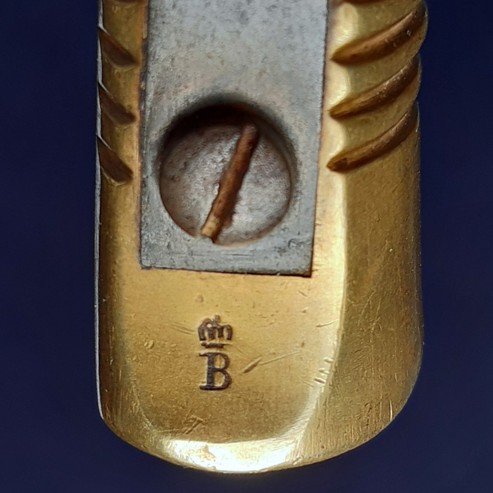 The ricasso of the blade is stamped on one side with the maker’s mark ‘P J MALHERBE A LIÈGE’ above an inspection stamp and the number ‘2’.  The hilt is stamped next to the leaf spring near the pommel with a crown over ‘B’.