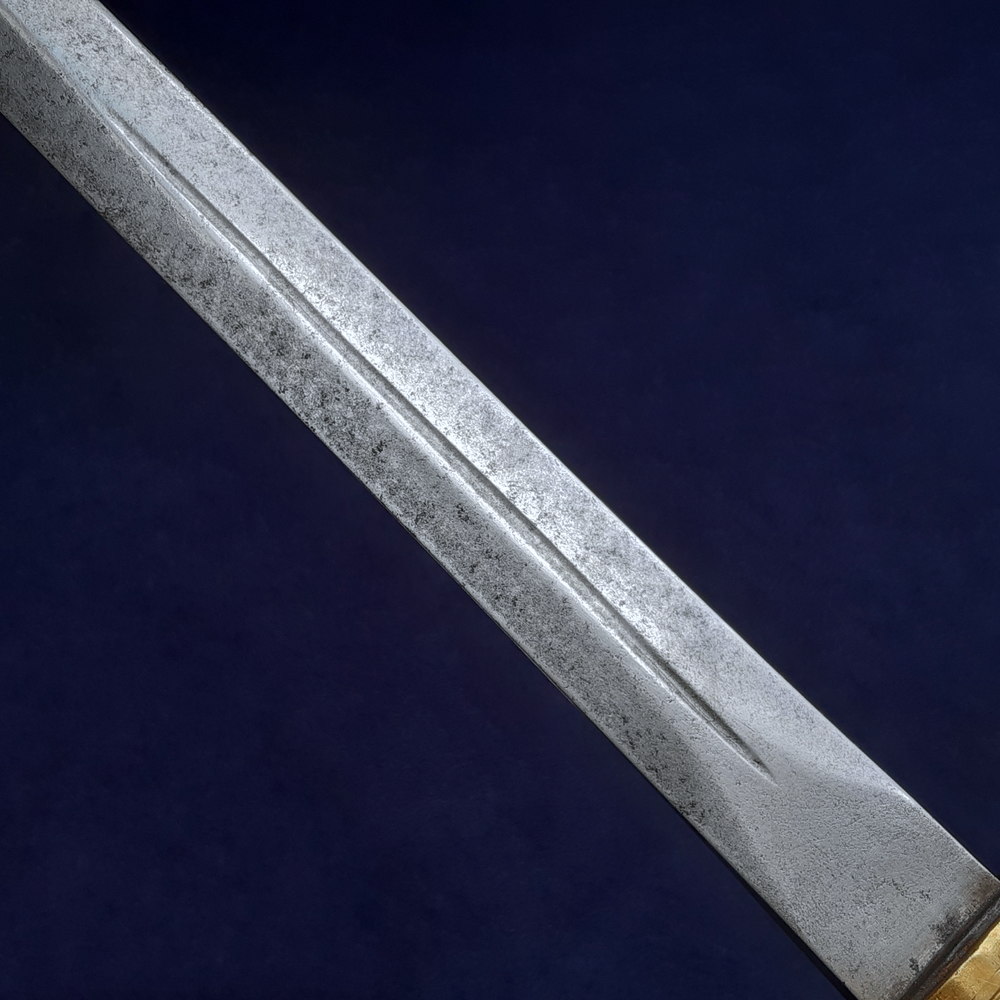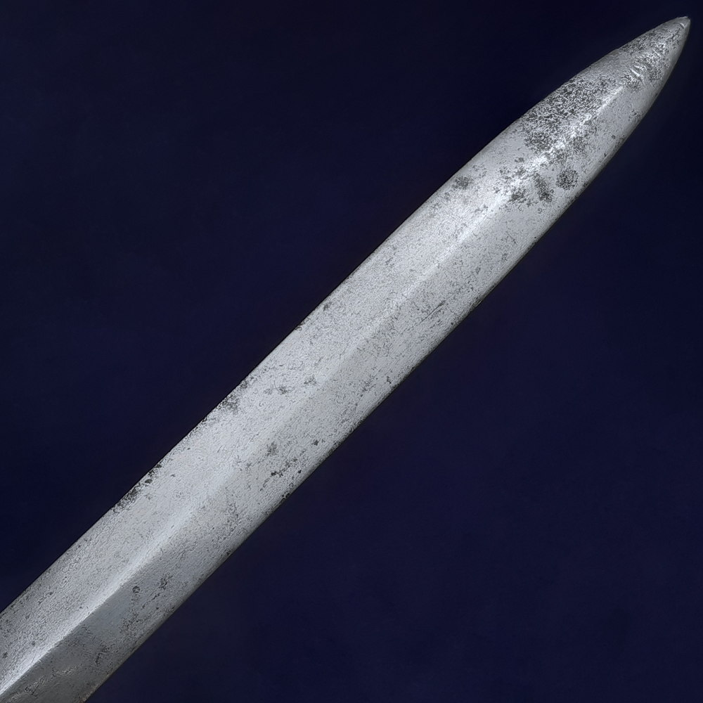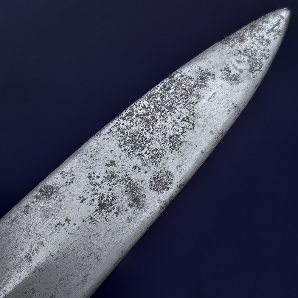 The blade’s lower section has some light patination and spots of pitting, a larger patch of pitting around the tip section on one side. The tip of the blade is slightly chipped. The hilt is in good condition with an even patina. The locking mechanism moves freely.
