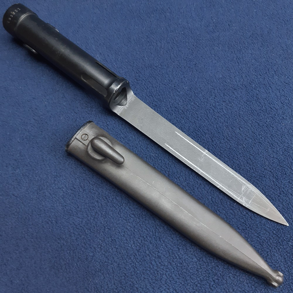 Tubular steel one-piece bayonet with flash ports and spear-pointed blade with semicircular profile. Blade length 6½ inches (16.5cm), 11 3/8 inches (28.9cm) overall. Black nylon plastic scabbard with frog hook, steel universal-type throat piece and finial with drainage hole.