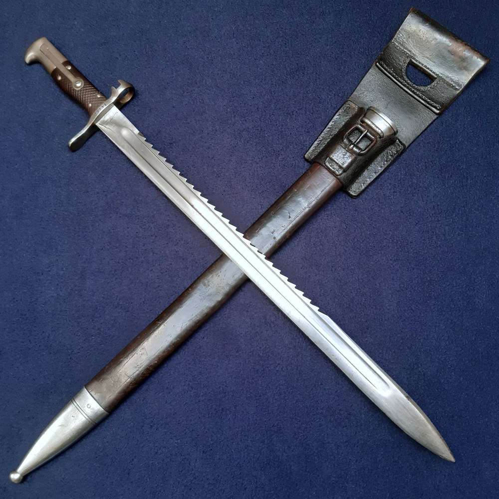 Its blade is also unusual in that it is flat on one side and with a ground edge on the other. It incorporated the then-popular ‘sawback’, saw teeth cut into the spine of the blade intended to make it useful for field work like cutting brush. The bayonet’s length is noticeable – when mounted the rifle and bayonet together are more than 6 feet in length. There are several successor models which used the same blade - the M1878 is the earliest version, produced for only three years, distinguishable by the four rivets used in its grip (reduced to three in the M1881).