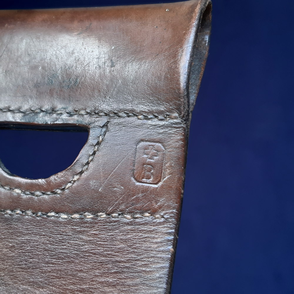 The blade is bright and clean overall, with only some very small spots of pitting towards the point on the flat side. The saw’s teeth are unbroken and do not appear heavily used. The grips are in good condition with no cracking, a couple of small chips around the rivets. No dents to the scabbard fittings. Some light dents and occasional scratches to the scabbard leather, its stitching is all intact. The black finish has rubbed on the front of the frog’s belt loop, but only where the pommel contacts it while sheathed.