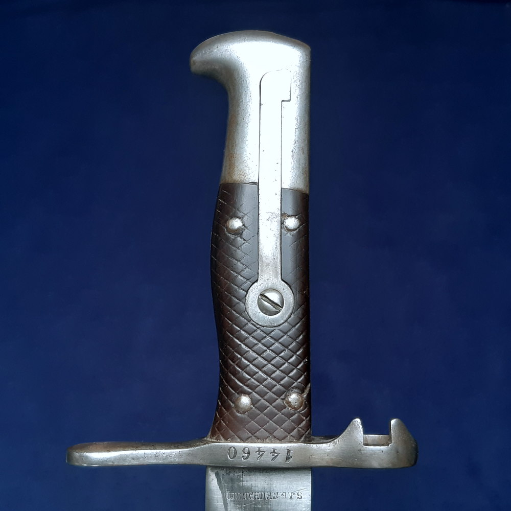 Thought to have been inspired by the British Elcho bayonet, the Swiss M1878 fitted to the 10.5mm Vetterli repeating rifle. This rifle was introduced in 1869 and originally used a socket bayonet. When the switch to a sword bayonet was ordered, the new model was designed to mount on the right side of the barrel rather than below it, like a socket bayonet, and with unusual projections from the muzzle ring that engaged with the foresight as it locked into place.