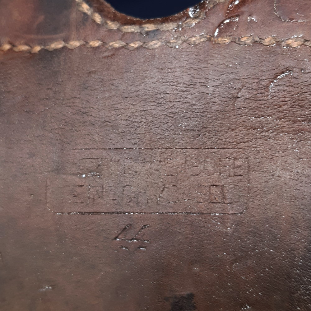The rear side of the leather frog is stamped with several marks faint from rubbing, including a square cartouche (which would have contained a letter but this is too faint to make out), the maker’s mark ‘____BUHE REINACH / BASEL’ - this would have been a saddlery/leatherwork firm contracted to produce the frog, based in the town of Reinach in the canton of Basel at the northern edge of Switzerland - and ‘44’, probably an item number.