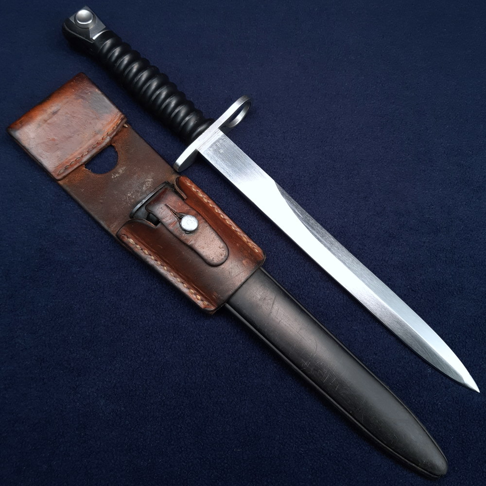 This bayonet fits the Swiss Sturmgewehr 57 (usually abbreviated to Stgw. 57) rifle, which was adopted by the Swiss military in 1957 to replace the M1931 (K31) bolt-action rifle.