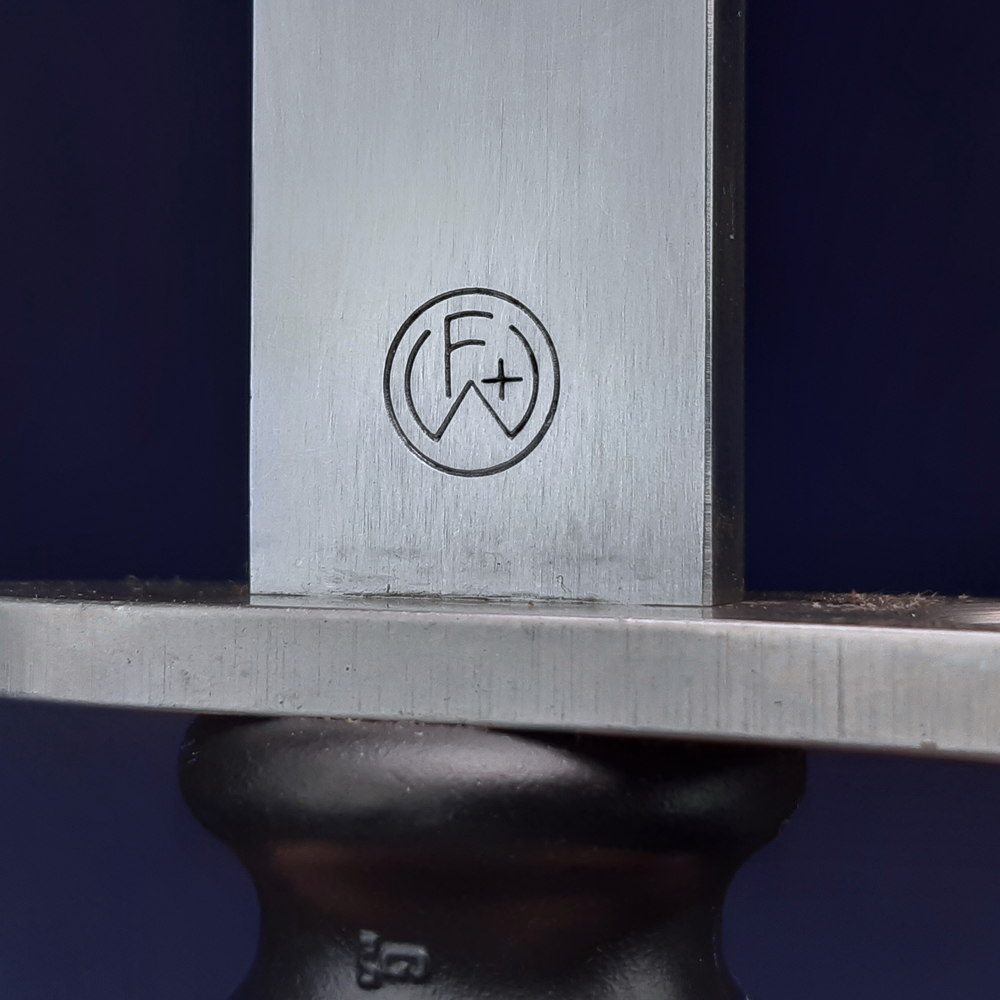 The hilt is stamped on one side with the mark of Waffenfabrik Bern where the bayonet was assembled, composed of the letters ‘FW’ and a Swiss cross arranged within a circle. It is stamped on the other side with ‘W’ for the maker Wenger and the serial number ‘466664’. The scabbard is stamped at the throat with ‘P’.